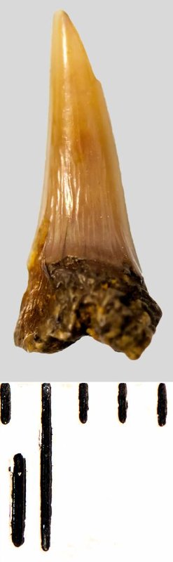 Зуб. Акула. Eostriatolamia subulata (Agassiz, 1843). Классификация: Хордовые Chordata, Позвоночные Vertebrata, Хрящевые рыбы Chondrichthyes, Пластиножаберные Elasmobranchii, Акулы Selachii, Ламнообразные Lamniformes, Песчаные акулы Odontaspididae