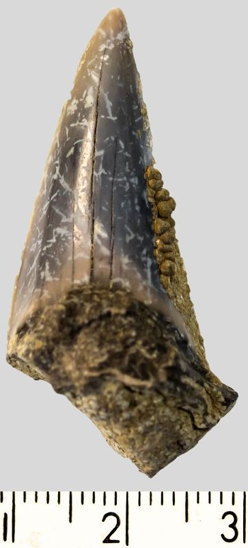 Зуб (фрагмент). Акула. Otodus subserratus (Agassiz, 1843). Классификация: Хордовые Chordata, Позвоночные Vertebrata, Хрящевые рыбы Chondrichthyes, Пластиножаберные Elasmobranchii