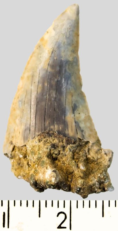 Зуб (фрагмент). Акула. Otodus subserratus (Agassiz, 1843). Классификация: Хордовые Chordata, Позвоночные Vertebrata, Хрящевые рыбы Chondrichthyes, Пластиножаберные Elasmobranchii