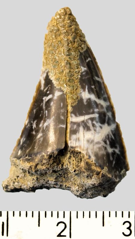Зуб (фрагмент). Акула. Otodus subserratus (Agassiz, 1843). Классификация: Хордовые Chordata, Позвоночные Vertebrata, Хрящевые рыбы Chondrichthyes, Пластиножаберные Elasmobranchii