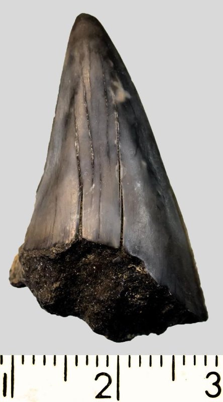 Зуб (фрагмент). Акула. Otodus subserratus (Agassiz, 1843). Классификация: Хордовые Chordata, Позвоночные Vertebrata, Хрящевые рыбы Chondrichthyes, Пластиножаберные Elasmobranchii