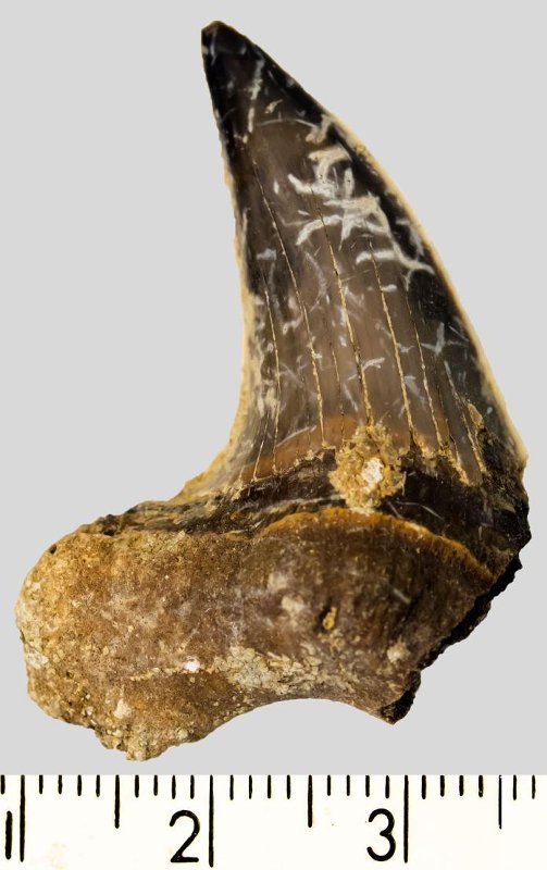 Зуб. Акула. Otodus subserratus (Agassiz, 1843). Классификация: Хордовые Chordata, Позвоночные Vertebrata, Хрящевые рыбы Chondrichthyes, Пластиножаберные Elasmobranchii