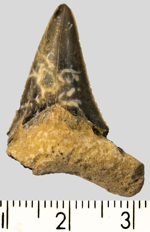 Зуб. Акула. Otodus subserratus (Agassiz, 1843). Классификация: Хордовые Chordata, Позвоночные Vertebrata, Хрящевые рыбы Chondrichthyes, Пластиножаберные Elasmobranchii