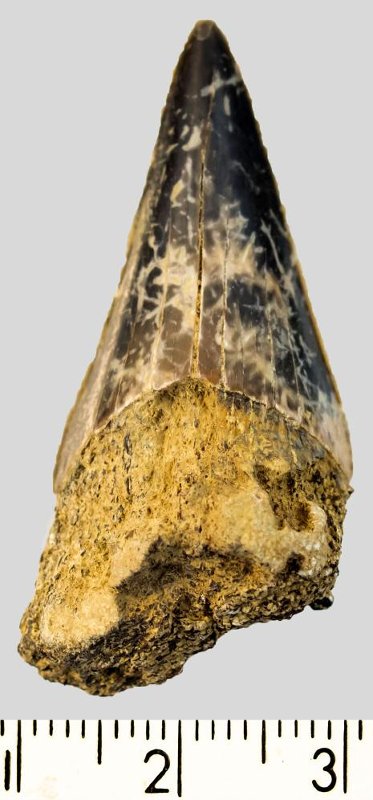 Зуб. Акула. Otodus subserratus (Agassiz, 1843). Классификация: Хордовые Chordata, Позвоночные Vertebrata, Хрящевые рыбы Chondrichthyes, Пластиножаберные Elasmobranchii