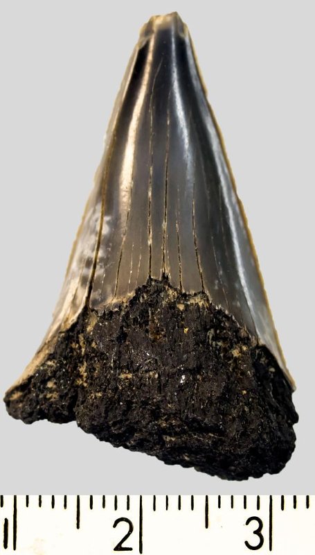Зуб. Акула. Otodus subserratus (Agassiz, 1843). Классификация: Хордовые Chordata, Позвоночные Vertebrata, Хрящевые рыбы Chondrichthyes, Пластиножаберные Elasmobranchii