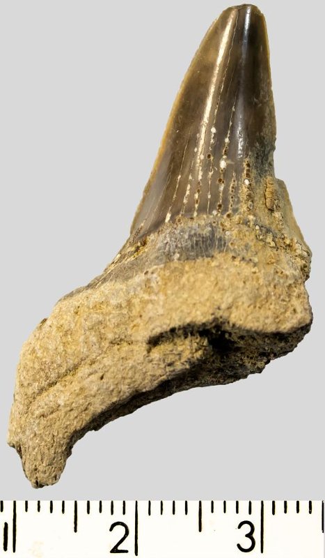 Зуб. Акула. Otodus subserratus (Agassiz, 1843). Классификация: Хордовые Chordata, Позвоночные Vertebrata, Хрящевые рыбы Chondrichthyes, Пластиножаберные Elasmobranchii
