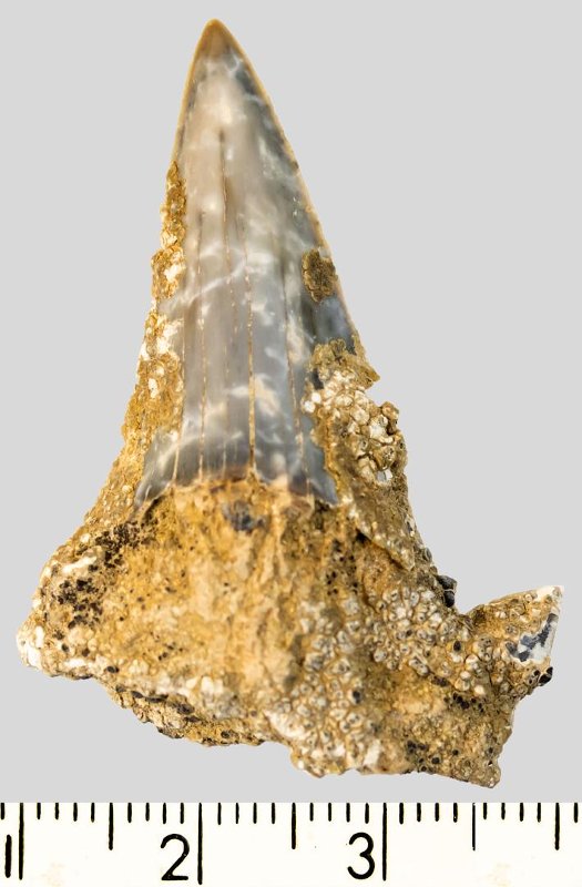 Зуб. Акула. Otodus subserratus (Agassiz, 1843). Классификация: Хордовые Chordata, Позвоночные Vertebrata, Хрящевые рыбы Chondrichthyes, Пластиножаберные Elasmobranchii