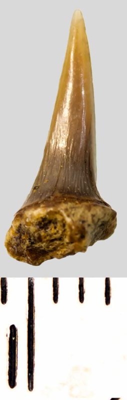 Зуб. Акула. Eostriatolamia subulata (Agassiz, 1843). Классификация: Хордовые Chordata, Позвоночные Vertebrata, Хрящевые рыбы Chondrichthyes, Пластиножаберные Elasmobranchii, Акулы Selachii, Ламнообразные Lamniformes, Песчаные акулы Odontaspididae