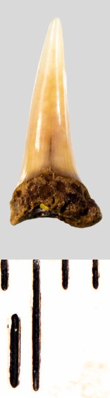 Зуб. Акула. Eostriatolamia subulata (Agassiz, 1843). Классификация: Хордовые Chordata, Позвоночные Vertebrata, Хрящевые рыбы Chondrichthyes, Пластиножаберные Elasmobranchii, Акулы Selachii, Ламнообразные Lamniformes, Песчаные акулы Odontaspididae