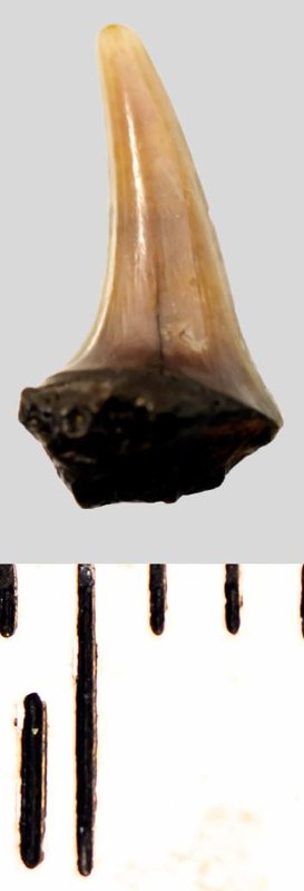 Зуб. Акула. Eostriatolamia subulata (Agassiz, 1843). Классификация: Хордовые Chordata, Позвоночные Vertebrata, Хрящевые рыбы Chondrichthyes, Пластиножаберные Elasmobranchii, Акулы Selachii, Ламнообразные Lamniformes, Песчаные акулы Odontaspididae