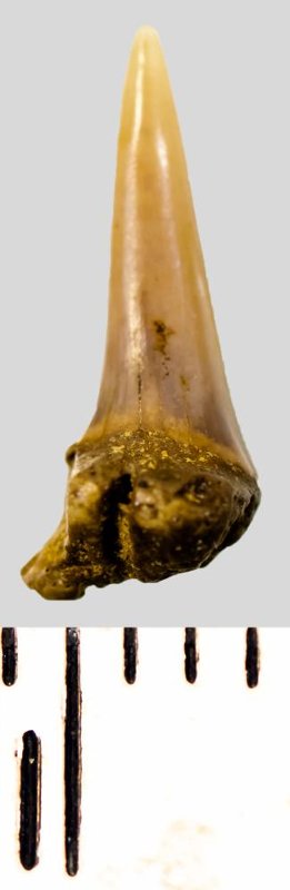 Зуб. Акула. Eostriatolamia subulata (Agassiz, 1843). Классификация: Хордовые Chordata, Позвоночные Vertebrata, Хрящевые рыбы Chondrichthyes, Пластиножаберные Elasmobranchii, Акулы Selachii, Ламнообразные Lamniformes, Песчаные акулы Odontaspididae