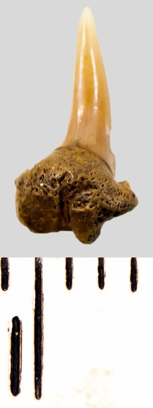 Зуб. Акула. Eostriatolamia subulata (Agassiz, 1843). Классификация: Хордовые Chordata, Позвоночные Vertebrata, Хрящевые рыбы Chondrichthyes, Пластиножаберные Elasmobranchii, Акулы Selachii, Ламнообразные Lamniformes, Песчаные акулы Odontaspididae