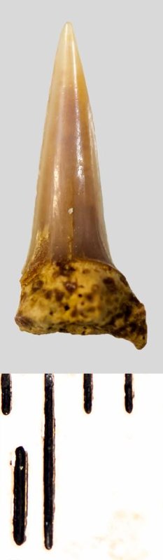 Зуб. Акула. Eostriatolamia subulata (Agassiz, 1843). Классификация: Хордовые Chordata, Позвоночные Vertebrata, Хрящевые рыбы Chondrichthyes, Пластиножаберные Elasmobranchii, Акулы Selachii, Ламнообразные Lamniformes, Песчаные акулы Odontaspididae