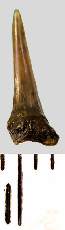 Зуб. Акула. Eostriatolamia subulata (Agassiz, 1843). Классификация: Хордовые Chordata, Позвоночные Vertebrata, Хрящевые рыбы Chondrichthyes, Пластиножаберные Elasmobranchii, Акулы Selachii, Ламнообразные Lamniformes, Песчаные акулы Odontaspididae