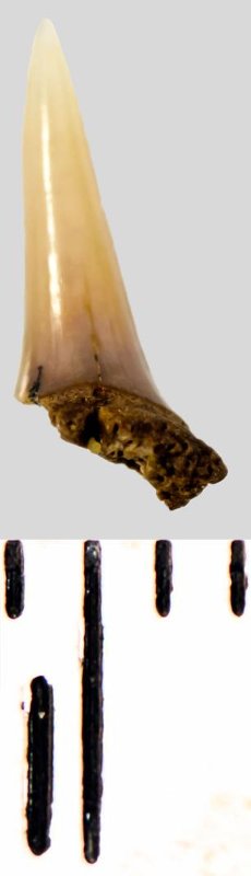 Зуб. Акула. Eostriatolamia subulata (Agassiz, 1843). Классификация: Хордовые Chordata, Позвоночные Vertebrata, Хрящевые рыбы Chondrichthyes, Пластиножаберные Elasmobranchii, Акулы Selachii, Ламнообразные Lamniformes, Песчаные акулы Odontaspididae