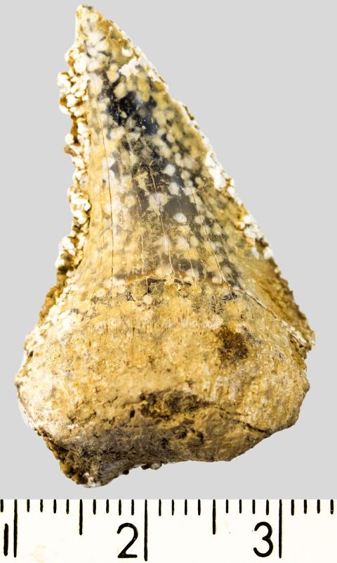 Зуб. Акула. Otodus subserratus (Agassiz, 1843). Классификация: Хордовые Chordata, Позвоночные Vertebrata, Хрящевые рыбы Chondrichthyes, Пластиножаберные Elasmobranchii
