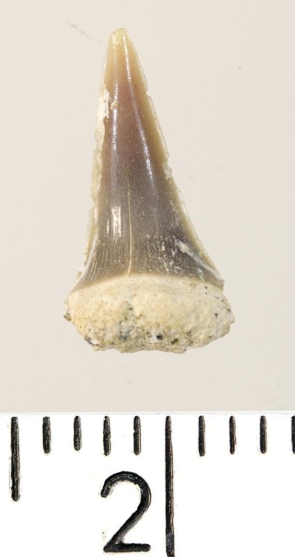Зуб (фрагмент). Акула. Hypotodus sp. Классификация: Хордовые Chordata, Позвоночные Vertebrata, Хрящевые рыбы Chondrichthyes, Пластиножаберные Elasmobranchii