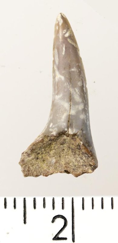 Зуб (фрагмент). Акула. Hypotodus sp. Классификация: Хордовые Chordata, Позвоночные Vertebrata, Хрящевые рыбы Chondrichthyes, Пластиножаберные Elasmobranchii