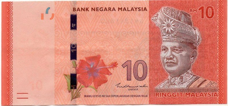 Денежная купюра прямоугольный формы (по горизонтали), выпущенная Банком Негара Малайзия. Доминирующими цветами банкноты является красный.