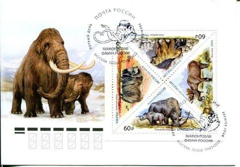 Конверт первого дня гашения с изображением мамонта с мамонтенком в пейзаже. Квадратный квартблок состоит из четырёх треугольных марок номиналом 60 рублей. (Художник – Салтыкова А.-М. Оформление – Савина О.) На каждой марке изображен представитель мамонтовой фауны в пейзаже: пещерный медведь и шерстистый носорог с детёнышами; лось и овцебык. Животные подписаны на русском и даны латинские названия. Перфорация рамочная 11¼. На конверте два штампа гашения с изображением головы мамонта (Художник – Егиазарян А.).