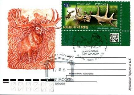 На открытке слева изображен красный большерогий олень, справа место для адреса. В верхнем правом углу марка с изображением черепа черепа большерогого оленя на зеленом фоне (из серии "Палеонтологическое наследие России 2020). Животное подписано на русском и дано латинское название. На конверте штампа гашения с изображением головы мамонта (Художник – Егиазарян А.) и штамп гашения музеев Москвы.