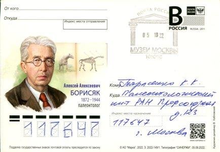 На открытке горизонтального формата слева погрудный портрет палеонтолога А.А. Борисяка, справа - место для адреса и штамп "Музеи Москвы".