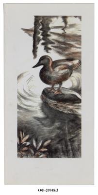 На открытке вертикального формата изображена путка, стоящая на камне, вокруг нее вода.