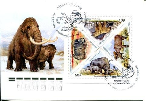 Конверт первого дня гашения с изображением мамонта с мамонтенком в пейзаже (Художник – Карпова Н.). Квадратный квартблок состоит из четырёх треугольных марок номиналом 60 рублей (Художник – Салтыкова А.-М. Оформление – Савина О.). На каждой марке изображен представитель мамонтовой фауны в пейзаже: пещерный медведь и шерстистый носорог с детёнышами; лось и овцебык. Животные подписаны на русском и даны латинские названия. На конверте два штампа гашения с изображением головы мамонта (Художник – Егиазарян А.).