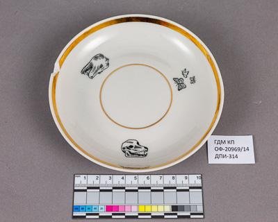 Круглой формы со слегка приподнятыми бортами. По борту деколь из 3 фрагментов: изображение муляжа головы собаки; черепа собаки и 3 летающих бабочек. По краю борта широкая золотая отводка, вокруг центра блюдца - тонкая.