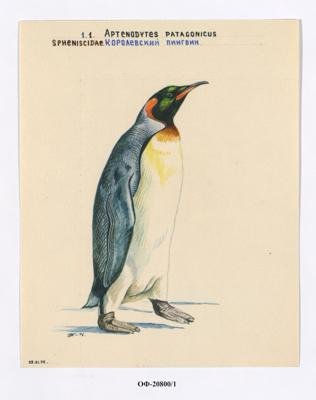 На листе вертикального формата изображен идущий слева направо королевский пингвин в 3/4. Его левая нога выставлена вперед и не касается земли.