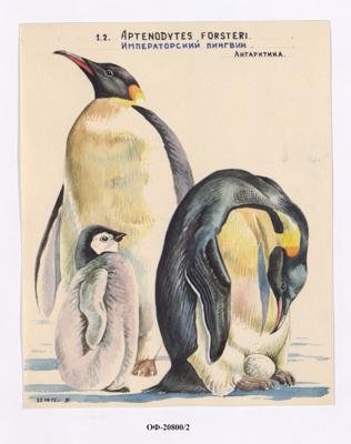 На листе вертикального формата изображены два взрослых императорских пингвина, птенец и яйцо. Слева изображены стоящий взрослый пингвин и птенец, справа - взрослый пингвин, склонившийся к яйцу, зажатому между лапами и животом.
