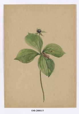 На листе вертикального формата изображен вороний глаз: над четырьмя листами на длинном стебельке подымается черная ягода.
