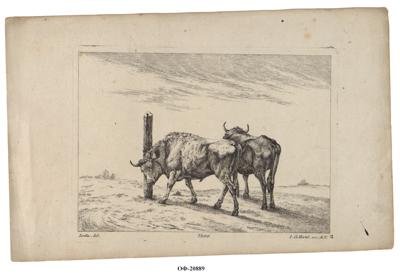 На листе горизонтального формата с большими полями горизонтальный оттиск с изображением двух быков в поле. Один из быков изображен боком головой влево, он прислонил голову к столбу. Рядом стоит бык и смотрит вдаль, он изображен сзади.