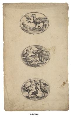 На листе вертикального формата три овальных пронумерованных оттиска с изображениями птиц, сверху вниз: 4. В горизонтальном овале изображен грифон, петух и две маленькие птички (голубь и горлица?). 5. В горизонтальном овале изображены два павлина, один из них с раскрытым хвостом, петух, гусь (?) и две маленькие птички. 6. В горизонтальном овале изображен страус с ключом в клюве (символ бдительности и опеки), венценосный журавль, в центре - ибис (?), вверху три маленькие птицы.