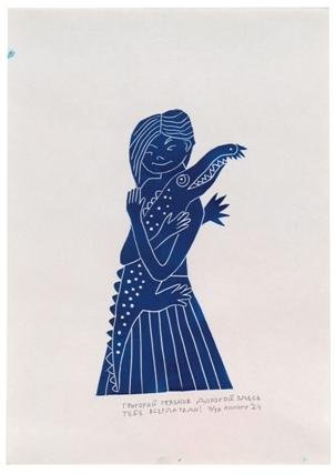 На листе вертикального формата на белом фоне красной синей дан силуэт девочки в длинном платье, обнимающей крокодилоподобное зубастое животное (протерозуха). Животное изображено боком, девочка - в три четверти влево.