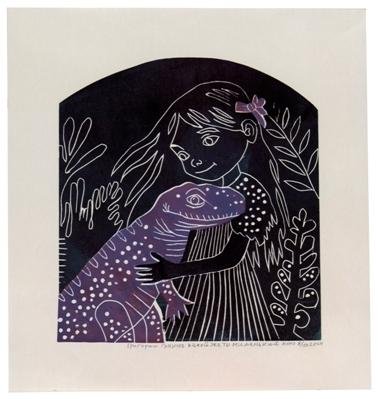 Какой же ты миленький! Девочка с териодонтом. Линогравюра