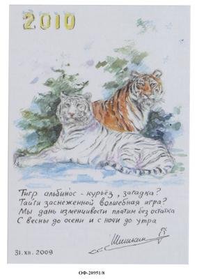 На листе вертикального формата изображены два лежащих тигра, на первом плане головой влево лежит белый тигр, за ним головой вправо - тигр обычной окраски. Вверху желтым: 2010.
