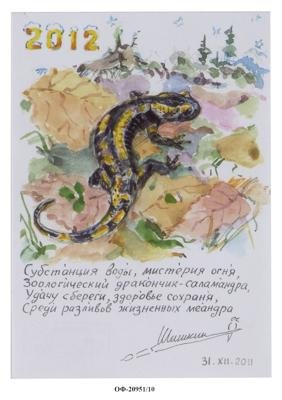 На листе вертикального формата на фоне пожухлой листвы изображена черно-желтая саламандра. Вверху желтым: 2012.