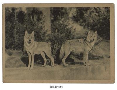 Фотооткрытка горизонтального формата черно-белая. На фоне маленьких елочек стоят два волка боком и смотрят в разные стороны. Оборотная сторона разделена вертикальной чертой, слева – место для письма, вверху слева издательский знак с надписью: «РСФСР Московский совет раб-кр. и кр.деп», справа – для адреса и для марки.