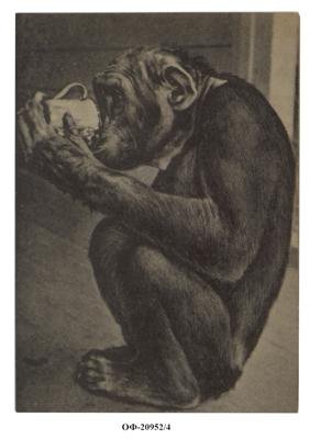 Фотооткрытка вертикального формата черно-белая. Шимпанзе Парис сидит боком и пьет из кружки. Оборотная сторона разделена вертикальной чертой, слева – место для письма, вверху слева логотип Московского зоопарка с головой лося с надписью: «Московский зоопарк», справа место для адреса и для марки.