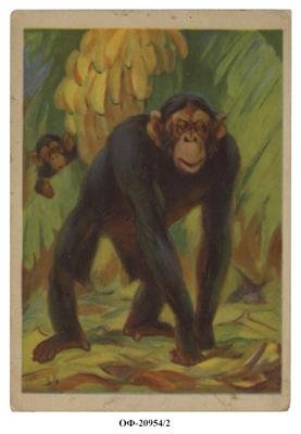 Открытка вертикального формата с белыми полями. На фоне тропической растительности и огромной кисти бананов крупно изображен стоящий шимпанзе, на дальнем плане из-за бананового листа выглядывает второй шимпанзе. На обороте место для адреса и для сообщения. Вверху логотип «ГИЗ».