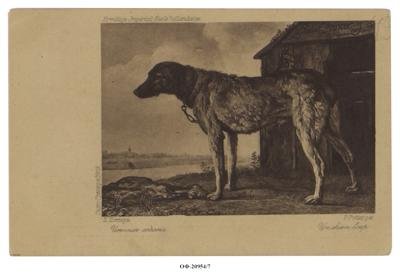 Открытка горизонтального формата с полями. На открытке боком изображен стоящий пес на цепи у будки на фоне пейзажа с рекой. На обороте слева изображен портик Эрмитажа, справ место для адреса.
