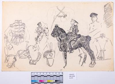 Композиция горизонтального формата. В левой части - зарисовки парадной формы офицеров гусарских полков: доломит (мундир), парадная шапка, лядунка. Справа - зарисовки офицеров гусарских полков верхом на лошадях в парадной и полевой форме.