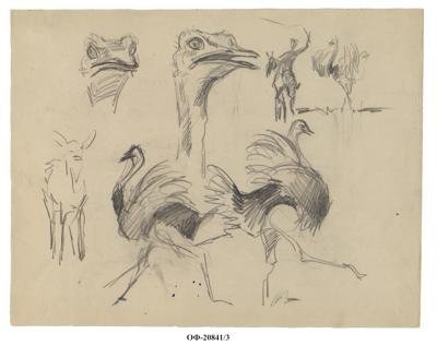 Наброски страуса, всадника и копытного. Рисунок