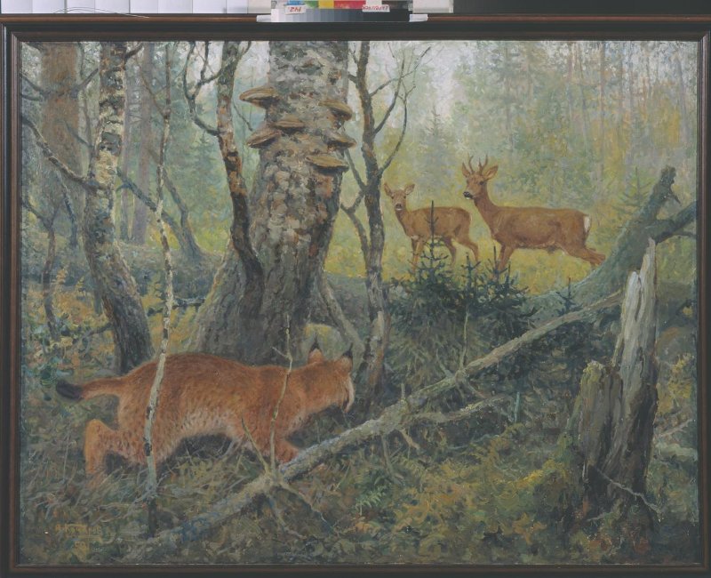 Картина горизонтального формата, основная колористическая гамма теплая. На первом плане слева изображена в профиль рысь, замершая на полусогнутых лапах, притаившись за толстым березовым стволом, поросшим древесными грибами. Окраска рыси рыжевато-палевая с темными пятнышками, а также черными кисточками на ушах и кончиком вытянутого параллельно земле короткого хвоста. Голова рыси с настороженными ушами повернута вглубь картины, туда, где на втором плане на ярко освещенной желто-зеленой поляне стоят две коричневато-рыжие косули: самец с небольшими рожками и безрогая самка. Косули смотрят в сторону хищника. На первом плане, погруженном в тень, лежат серебристо-зеленоватые упавшие стволы деревьев, между которыми пробивается еловая поросль. Справа возвышается расщепленный пень, поросший зеленым мхом. На третьем плане виднеется хвойный лес. Линия горизонта расположена высоко, небо светло-серое. Краски наложены густо, пастозно.
