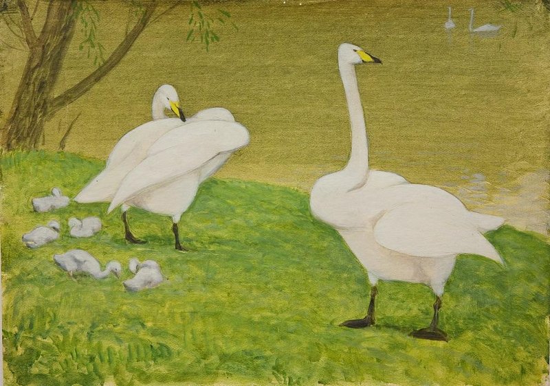 На листе горизонтального формата, на светло-зелёном условном фоне (ярко-зелёный - берег, оливково-зелёный вода) изображены два белых лебедя с черно-желтыми клювами и черными лапами и пять белых птенцов. На дальнем плане слева изображено оливково-коричневое дерево. Лебедь изображен боком головой вправо, он стоит, подняв голову над крылом. За ним сидят птенцы в разных позах. Второй лебедь, на первом плане справа, стоит в профиль влево, его шея вытянута, голова повёрнута вправо, он наблюдает за окрестностями. На дальнем плане справа плывут два лебедя.