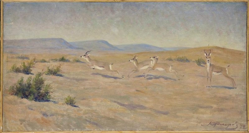 Полотно горизонтального формата, основная колористическая гамма теплая. На картине изображены четыре джейрана, бегущих по выжженной солнцем степи. В центре композиции стремительно скачут справа налево три джейрана: первым бежит самец, украшенный черными, изящно изогнутыми рожками, а за ним следуют две безрогие самки. Справа замер в настороженной позе еще один джейран. Его украшенная изогнутыми рожками голова с настороженными ушами повернута в сторону зрителя. Окраска джейранов почти сливается с окружающим пейзажем, только контрастно выделяются черные носы, глаза, рожки, копытца и хвосты. Вокруг животных расстилается охристо-желтая степь, кое-где покрытая небольшими зелеными кустиками какого-то растения. На горизонте видны голубые горы. Ясное голубое небо слегка светлеет к горизонту. Весь пейзаж словно окутан легкой дымкой знойного марева. Краски наложены плотно, кое-где на первом плане просвечивает белый грунт.
