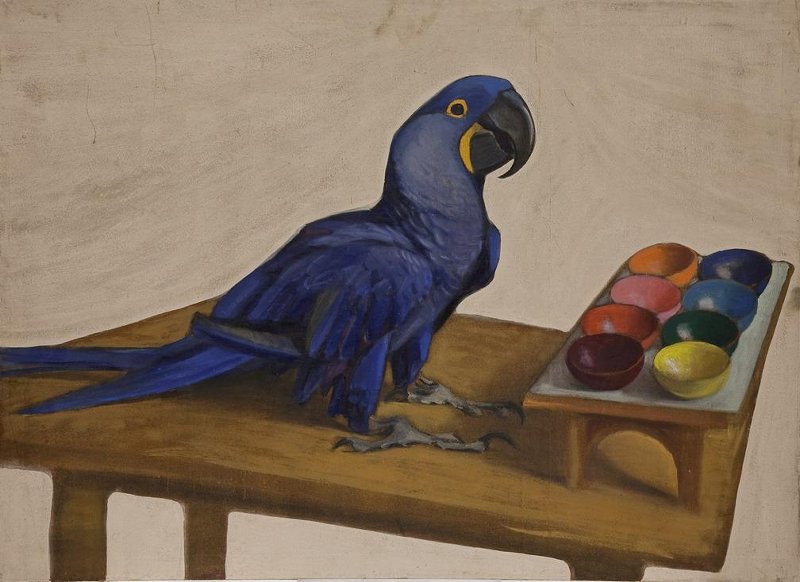 На листе горизонтального формата, на светло-сером фоне изображен в профиль вправо ярко-синий попугай с черным клювом. Он сидит на небольшом деревянном столике, перед ним подставка с восемью разноцветными полусферами.