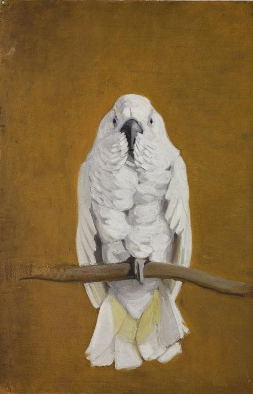 На листе вертикального формата, на охристом фоне в фас изображен сидящий на ветке белый какаду в спокойном состоянии. Крылья опущены, видна одна лапа. Перья серовато-белые, в хвосте с оливковым отливом, глаза и клюв черные.