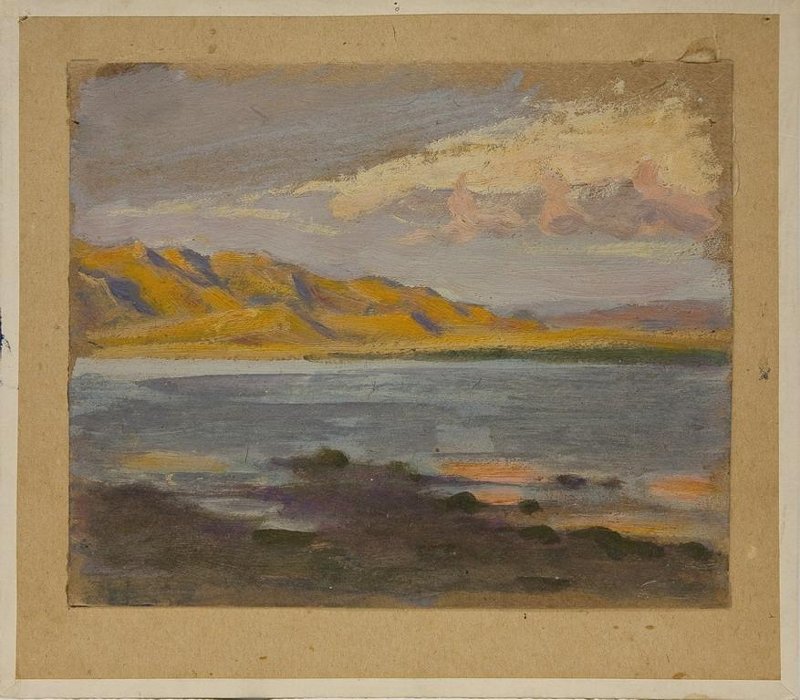 На листе почти квадратного формата изображен пейзаж с озером и горами. На первом плане изображен пологий берег, погруженный в фиолетовую тень, на среднем плане – голубая гладь озера, на дальнем плане слева – освещённая солнцем горная цепь, справа – большое облако, розоватое по краям. Края листа свободны от красочного слоя.